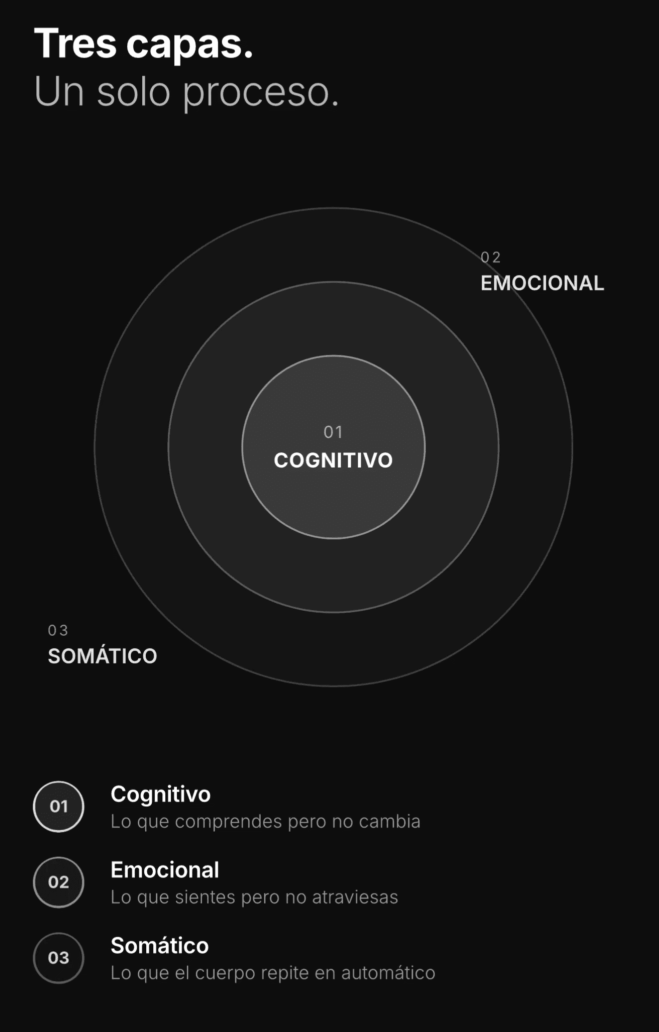 En 8 semanas disuelves lo que decide por ti: tus patrones emocionales, tus heridas activas y la forma inconsciente en la que te relacionas con la vida.